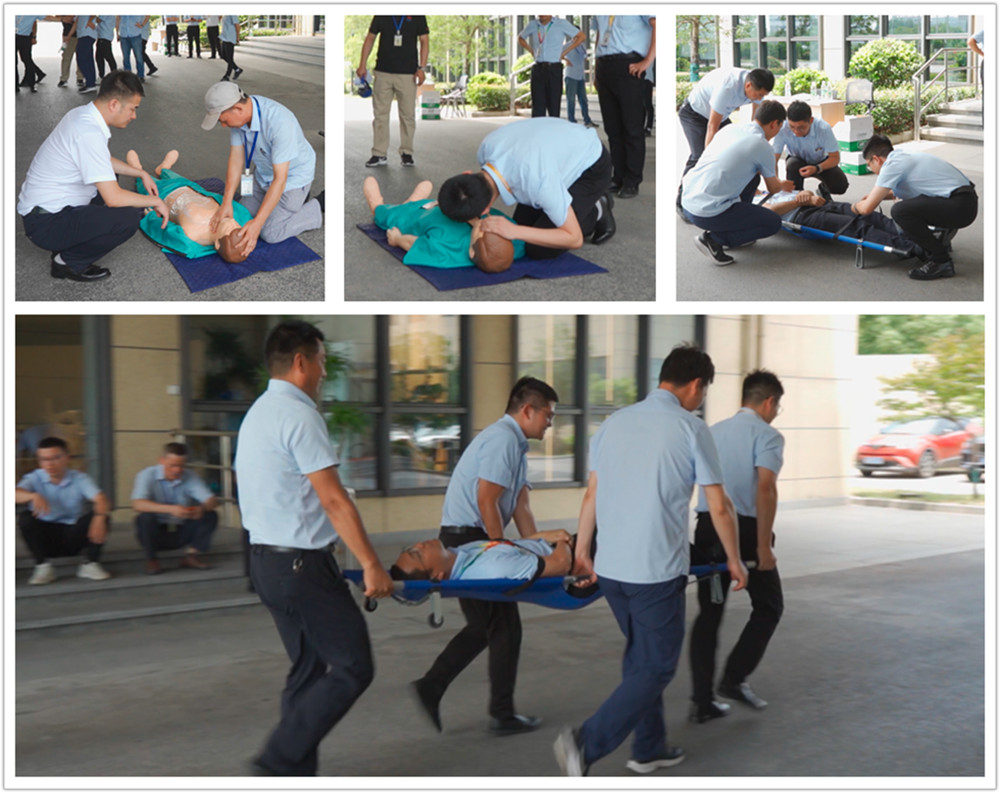 演练中,参演人员沉着冷静、分工明确、反应迅速。判断意识、摆放体位、建立人工循环(按压位置,按压频率)、开放气道、人工呼吸等施救步骤,一个都不能少。