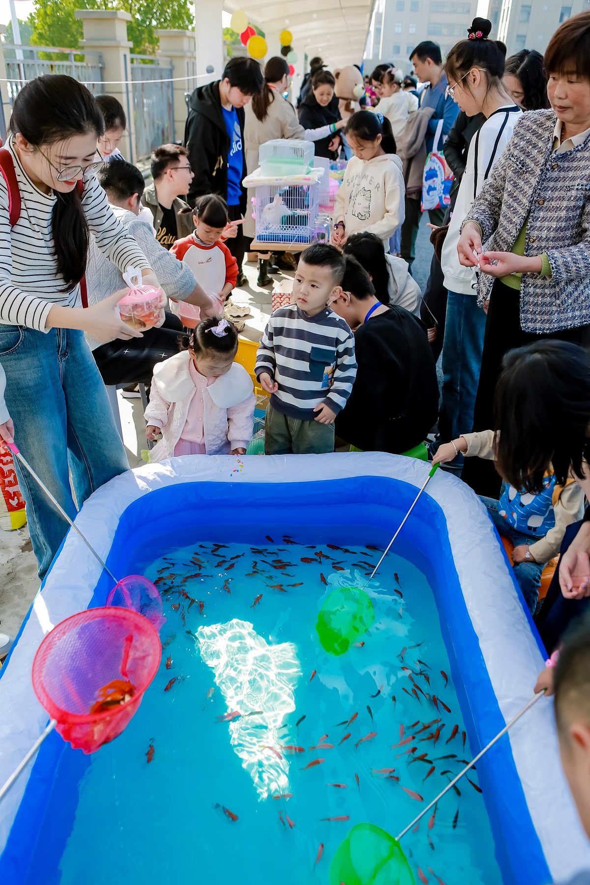各种可爱的小动物吸引了萌娃们的目光。孩子们在这里可以近距离地接触小乌龟、小仓鼠、小螃蟹。捞小鱼、抱兔子,谁会不爱软糯的萌宠呢?
